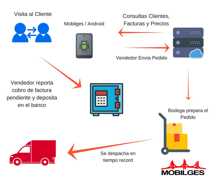 Una aplicación para automatización de fuerza de ventas, que se instala en teléfonos o tabletas Android que se integra al sistema informático de la empresa, lo que permite enviar pedidos y hacer consultas en tiempo real por medio de la red telefónica celular (GPRS)
