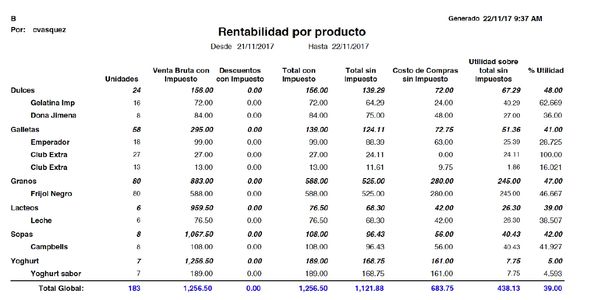 Usted podrá conocer exactamente cuanto gana por sus ventas en diferentes categorías y productos, y hacer consultas históricas para analizar el comportamiento de su rentabilidad.