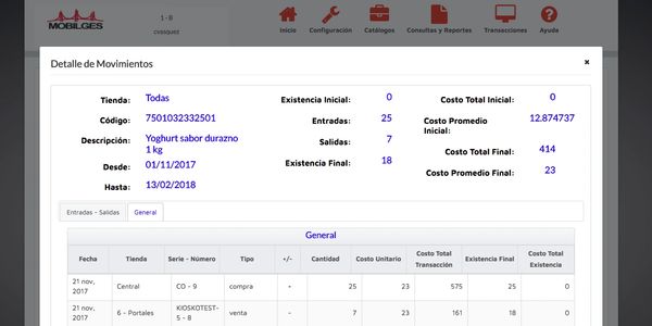 El portal muestra en forma detallada las entradas y salidas de productos de bodega y tiendas, ya sea por facturación, compra o traslados entre tiendas.